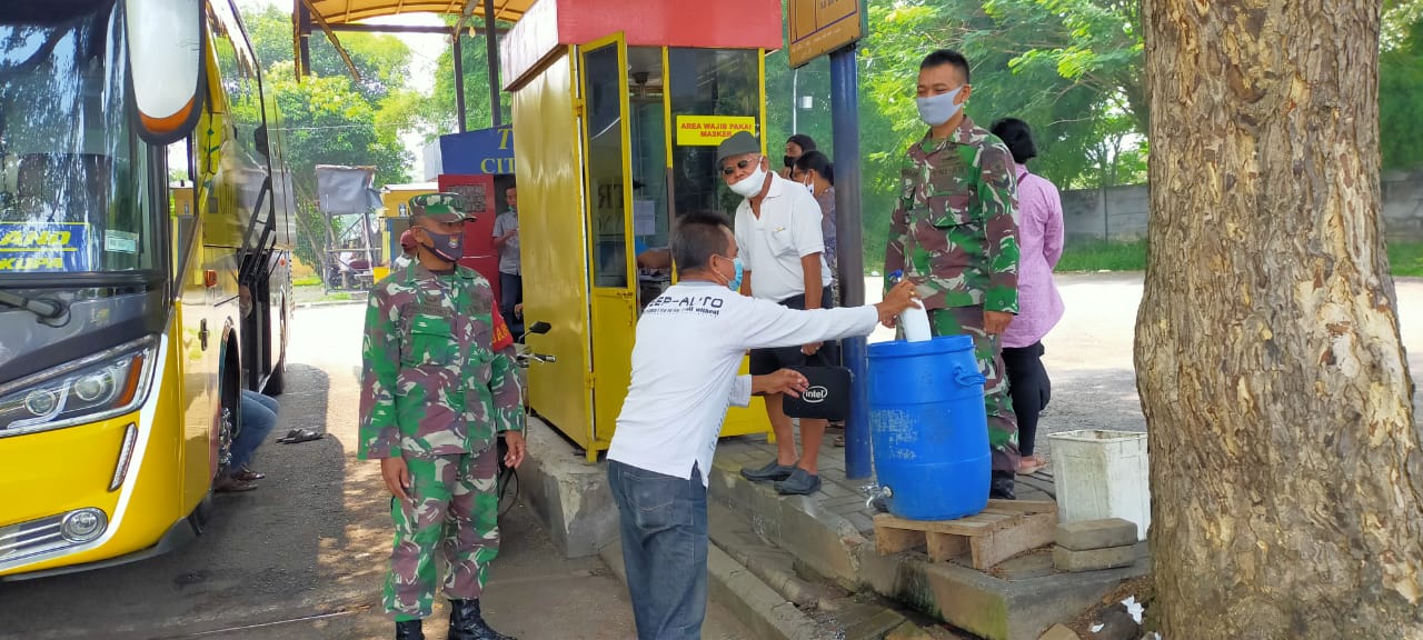 Kabupaten Tangerang – Memutus penyebaran Corona, jajaran Personil TNI dari Koramil 04/Cikupa Kodim 0510/Trs, Korem 052/Wkr tidak bosan menghimbau kepada para calon penumpang bus Terminal Trans Citra Raya, Desa Cikupa Kecamatan Cikupa Kabupaten Tangerang melaksanakan 3 M, Selasa (20/10/2020).
