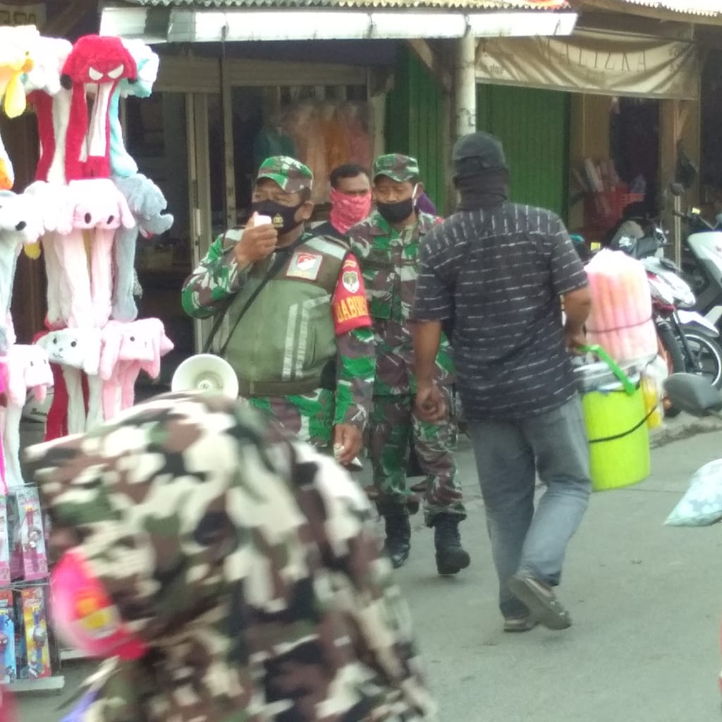 Kabupaten Tangerang – Dengan berjalan kaki dan dibekali pengeras suara anggota Koramil 07/Kresek Kodim 0510/Trs melakukan PDMPK patroli di pasar Kresek Kabupaten Tangerang, Selasa (13/10/2020).