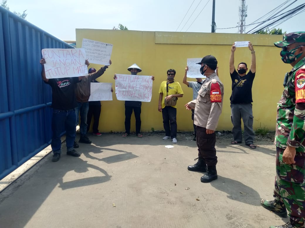 Tigaraksa – Mengantisipasi bergejolaknya Unjuk Rasa (Unras) buruh, anggota Koramil 13/Cisoka Kodim 0510/Trs Bersama Binamas melakukan Simulasi Unras di PT Buntara Jalan Raya Serang Desa Sumur Bandung Kecamatan Jayanti Kabupaten Tangerang, Jumat (16/10/2020).