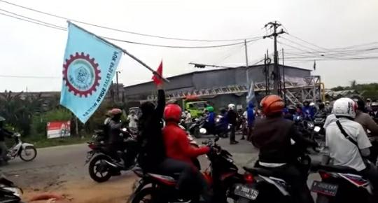 Ratusan buruh yang tergabung dari berbagai serikat buruh harus tertahan di Jalan Kalimalang, terhalangnya ratusan buruh ini karena aparat keamanan memblokade jalur Bekasi-Jakarta melalui Kalimalang.