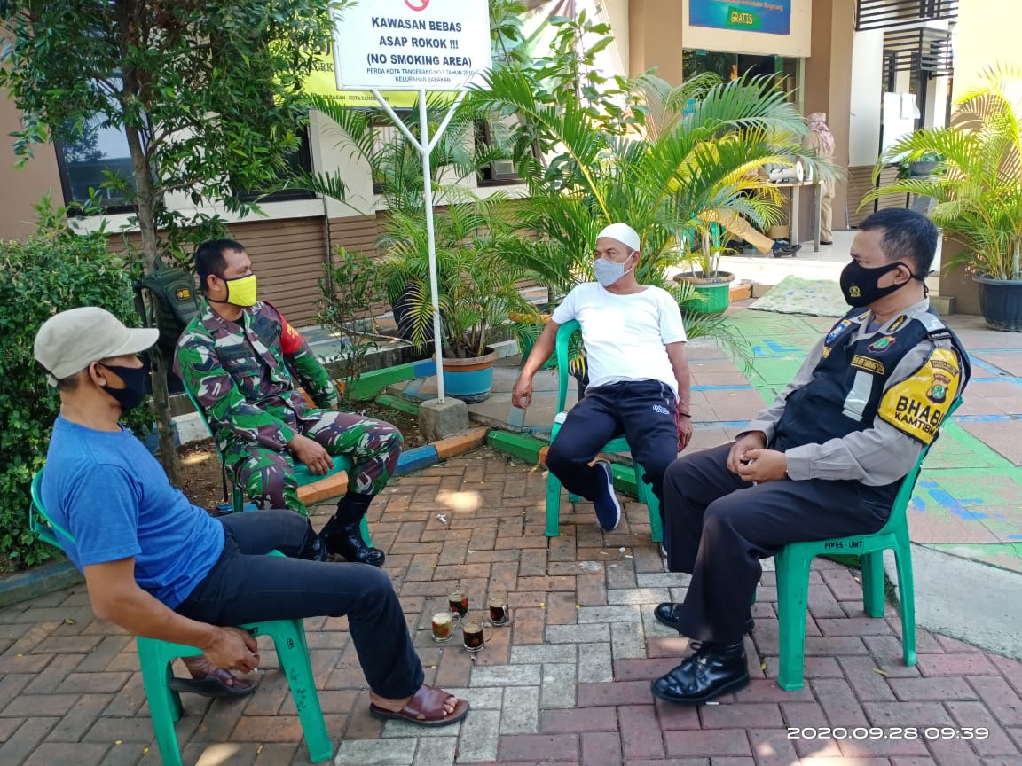 Kota Tangerang – Membantu menghimbau kepada warga masyarakat dalam memutus rantai pencegahan penyebaran Covid-19, anggota Koramil 01/Tgr Kodim 0506/Tgr, Korem 052/Wkr Sertu Gatot Sunaryo Bersama Binamas Aipda Adi Permanabmelakukan Silaturahmi dengan Wahyudin Ketua RT di Kantor Kelurahan Babakan Kecamatan Tangerang Kota Tangerang, Minggu (04/10/2020).