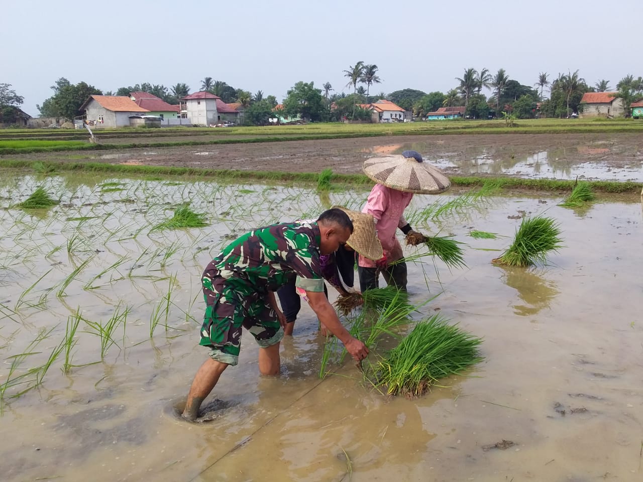 Kabupaten Tangerang – Membantu pemerintah mensukseskan Program Swasembada pangan untuk kuatkan Ketahanan Pangan Nasional, Babinsa Desa Sukamanah Koramil 12/Rajeg Kodim 0510/Trs Serda Sutanto membantu Poktan Bina Haraoan menanam padi di areal lahan persawahan di Kampung Sumur Daon Desa Sukamanah Kecamatan Rajeg Kabupaten Tangerang, Senin (21/12/2020).