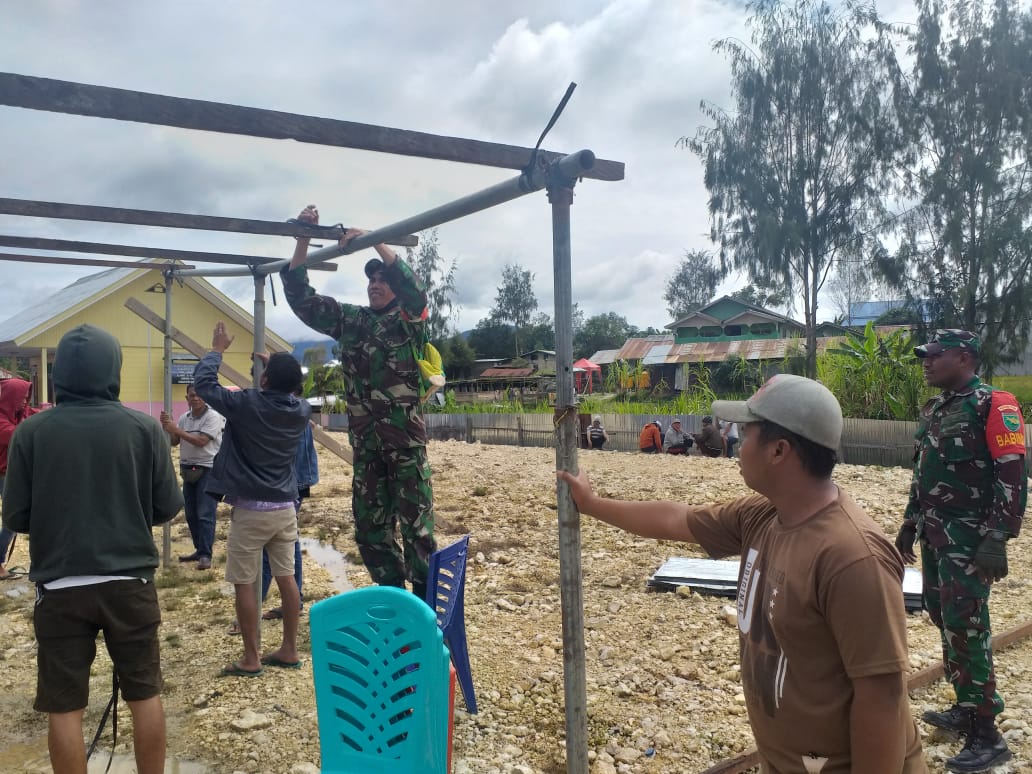 Waghete – Anggota Babinsa Koramil 1705-03/Waghete Serda Natalis beserta 2 orang anggota Babinsa dan bersama Masyarakat laksanakan kerja bakti pemasangan tenda di Gereja Yudhea Waghete 1 Distrik Wagethe Kabupaten Dogiyai