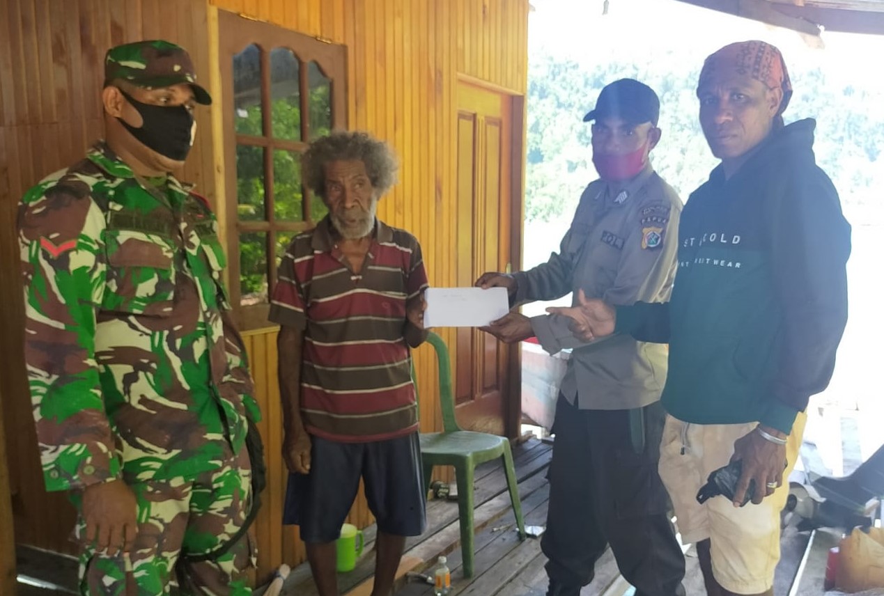 Yapen – Untuk memastikan Pembagian Dana BLT (Bantuan Langsung Tunai) aman dan tepat sasaran, Babinsa Koramil 1709-01/Yapsel Kodim 1709/Yawa Kopda Budi H. Kosay bersama Bhabinkamtibmas Bripka Max Wamea, mendampingi Aparat Kampung dan membantu Pembagian BLT Dana Desa kepada masyarakat Wanampompi Distrik Angkaisera Kab. Kep. Yapen, Minggu (27/12/2020).