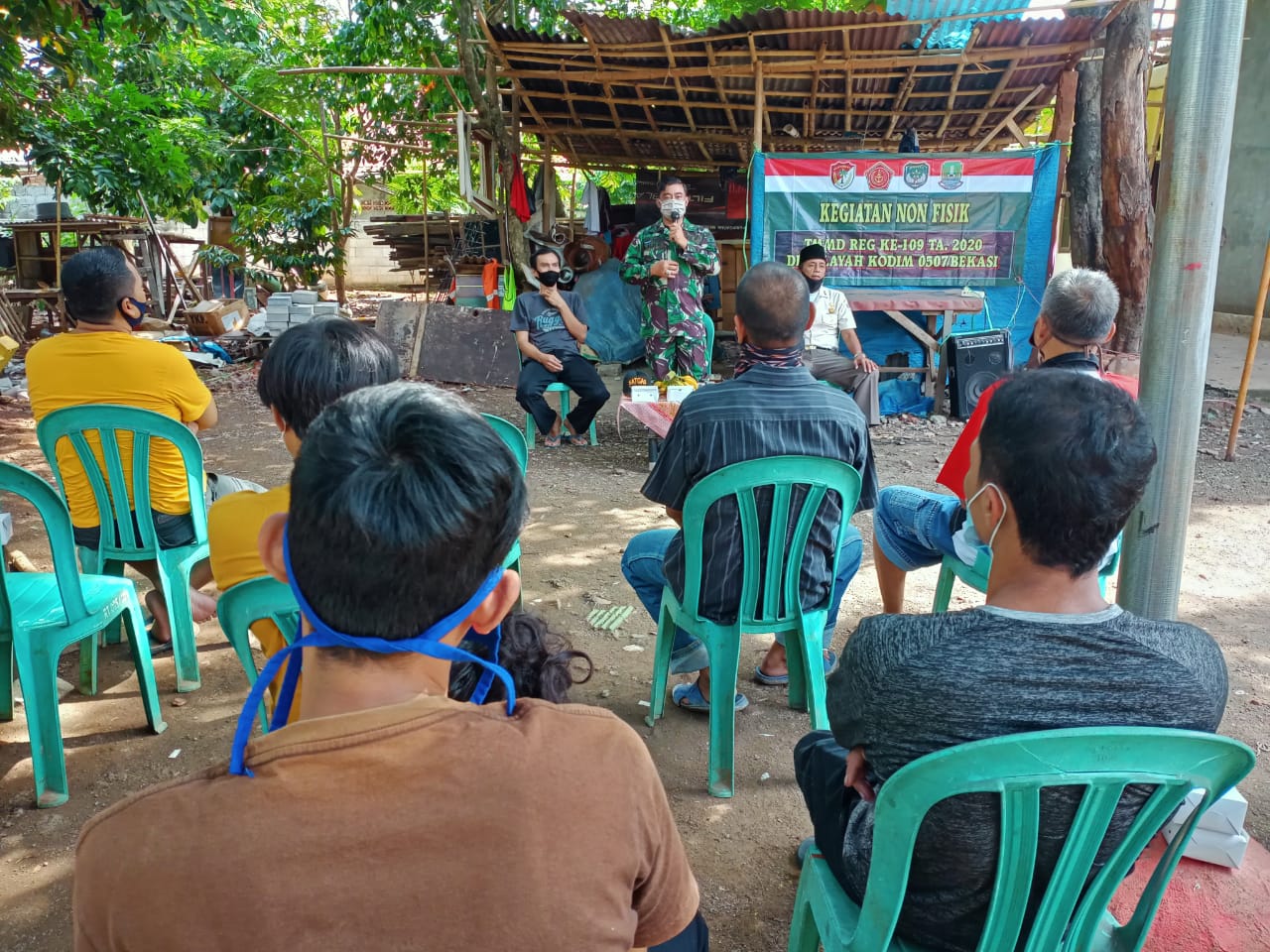 Bekasi – Program TNI Manunggal Membangun Desa (TMMD) ke-109 tahun 2020 Kodim 0507/Bekasi dengan sasaran non fisik, Bintaldam Jaya/Jayakarta melakukan penyuluhan Wasbang di Rumah Bpk. Misar Ketua Rt 05 / 01 Kel. Mustik Jaya Kota Bekasi ,Minggu (11/10/2020).
