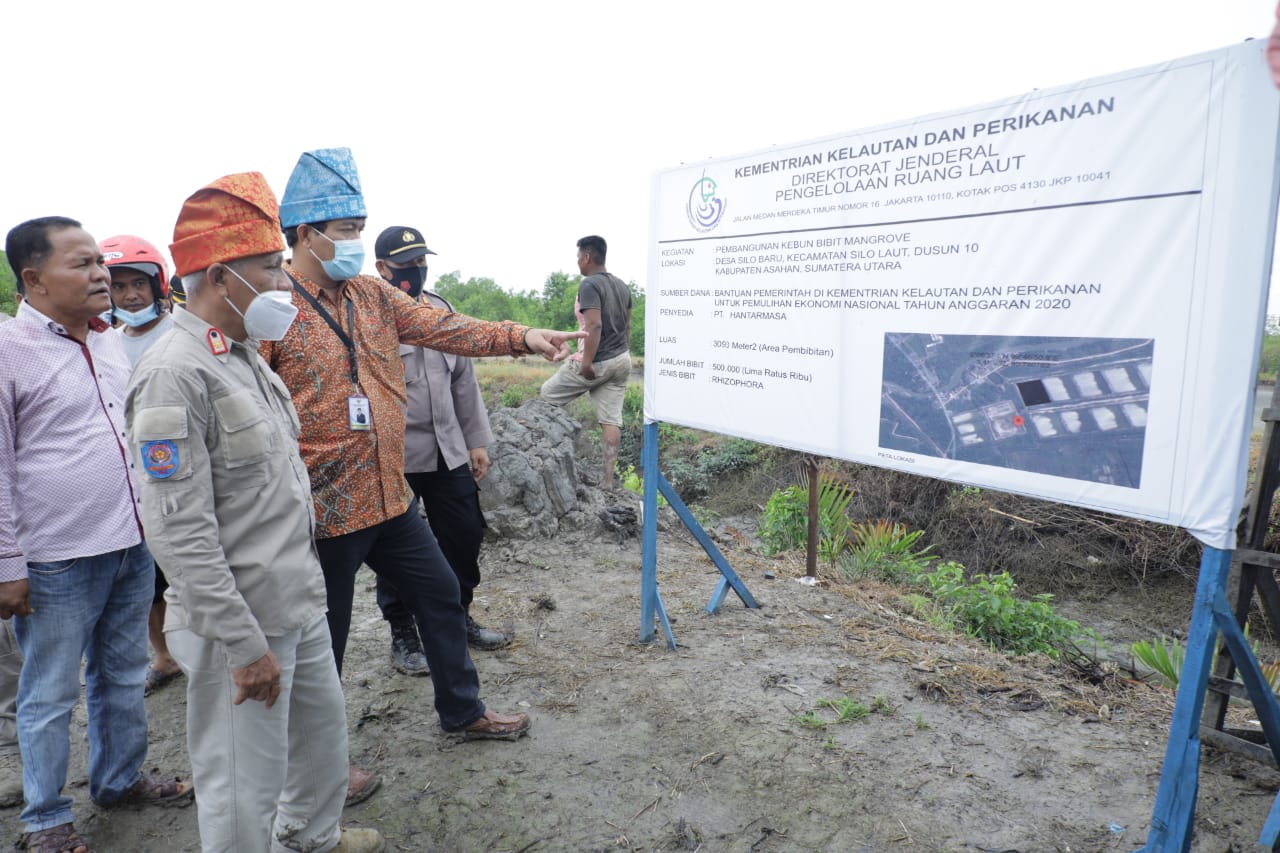 Asahan – Bupati Asahan H. Surya, BSc Bersama Staf Ahli Menteri Bidang Manajemen Konektivitas Kementerian Koordinator Maritim dan Investasi Sahat M Panggabean, Direktur Pendayagunaan Pesisir dan Pulau Pulau Kecil, Rektor UNA, OPD Terkait melakukan Peresmian Nursery Mangrove di Desa Silo Baru Kecamatan Silo Laut, Sabtu (19/12/2020).