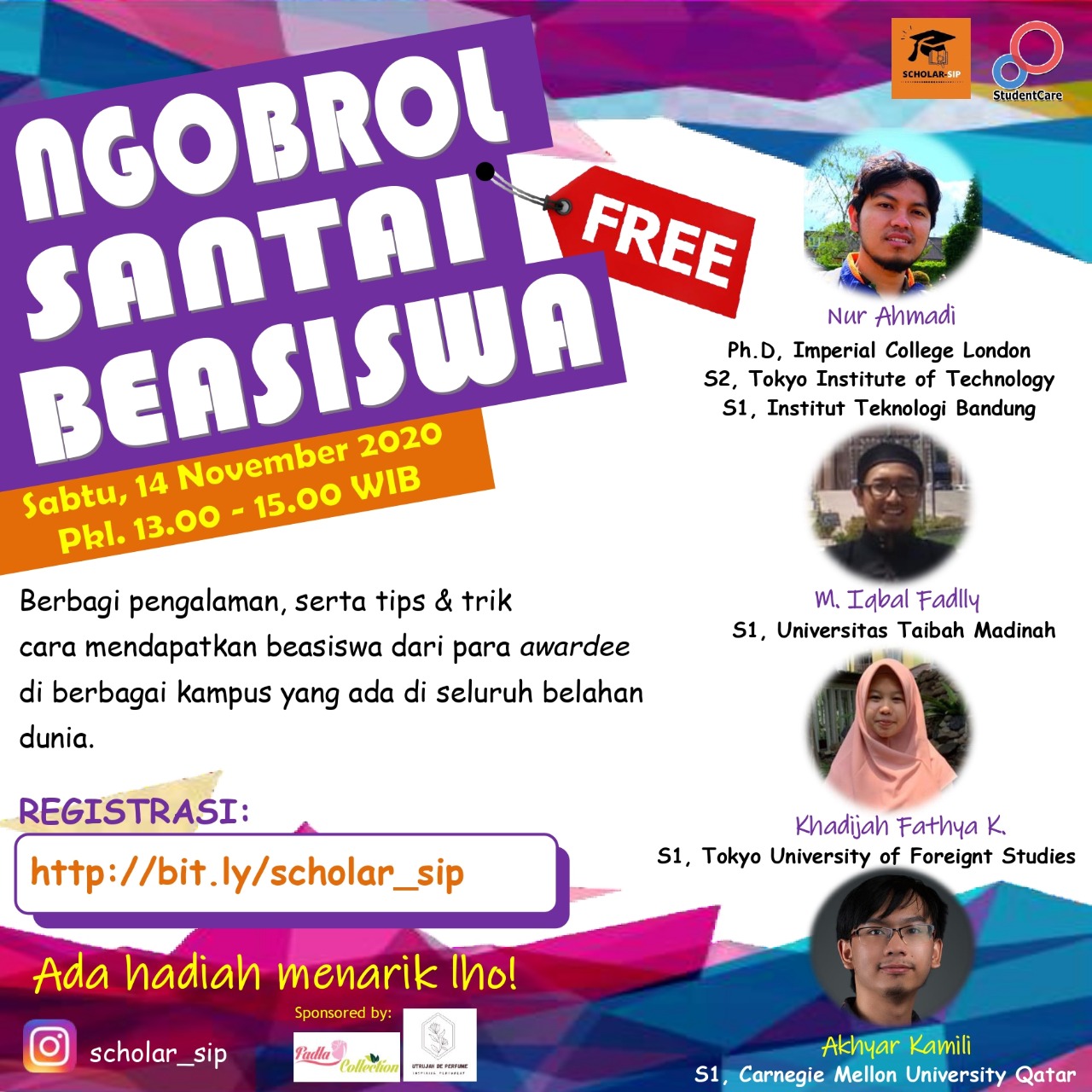 Bagi millenial yang ingin mendapatkan informasi mengenai tips dan trik mendapatkan beasiswa Perguruan Tinggi dalam dan luar negri, ScholarSip Student Care akan menyelenggarakan acara Ngobrol Santai via Zoom Online dengan para penerima beasiswa dari Universitas Terbaik dalam maupun luar negri.