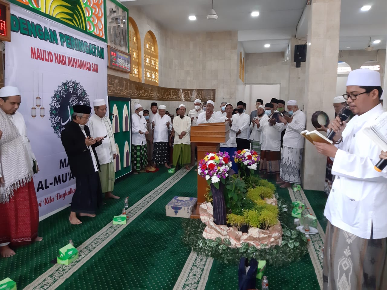 Ketua DKM Masjid Al-Mu’awanah H Usman jafar asgaf mengatakan, dalam kegiatan peringatan Maulid Nabi Muhammad SAW ditengah pandemi tetap menedepankan protokol kesehatan.