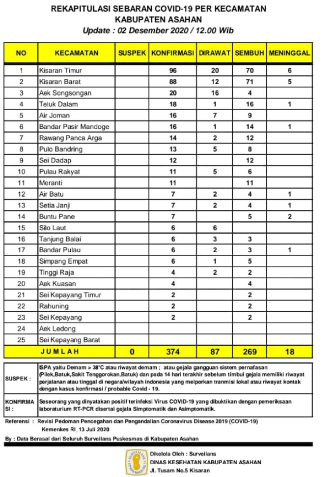 Demikian data update tersebut disampaikan Juru Bicara Gugus Tugas Percepatan Penanganan Covid-19 Kabupaten Asahan H. Rahmat Hidayat Siregar, SSos, MSi, berdasarkan hasil data surveilans dari seluruh puskesmas yang ada di wilayah Kabupaten Asahan sebagaimana dikelola Dinas Kesehatan Kabupaten Asahan pertanggal 02 Desember 2020 hingga pukul 12.00 Wib, pada hari Rabu, (02/12/2020) melalui grup WhatsApp Kominfo.