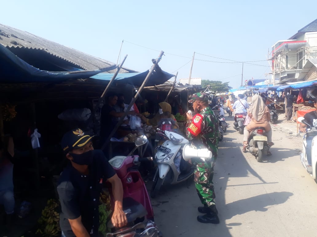 Kabupaten Tangerang – Upaya memberikan edukasi 3 M Memakai masker menjaga jarak dan mencuci tangan Danramil 08/Kronjo Kodim 0510/Trs Kapten Inf Sutrisno berkeliling di pasar Kronjo dengan berjalan kaki, Sabtu (07/11/2020).