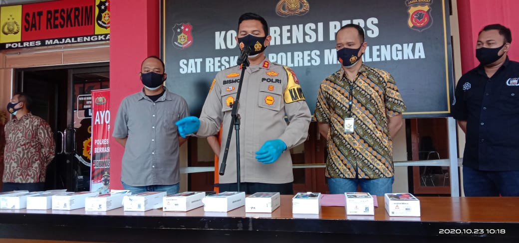Majalengka – Empat kasus tindak pidana diungkap Satuan Reserse Kriminal Polres Majalengka, Polda Jawa Barat. Konferensi pers, tindak pidana pencabulan, penipuan disertai penggelapan, pencurian toko handphone, dan pencurian kendaraan di halaman Satreskrim Polres Majalengka. Jumat, (23/10/2020)