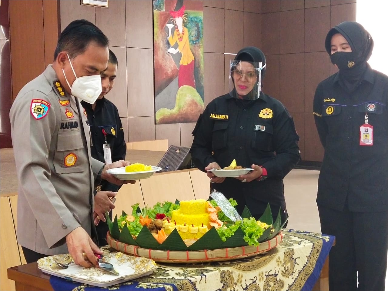 Selesai melaksankan Vidio Live bersama Kadiv Humas Polri, dilanjutkan dengan pemasangan rompi, masker, pembagian sembako dan pemotongan tumpeng oleh Irwasda Polda Sumbar Drs. Kasihan Rahmadi SH, MH.
