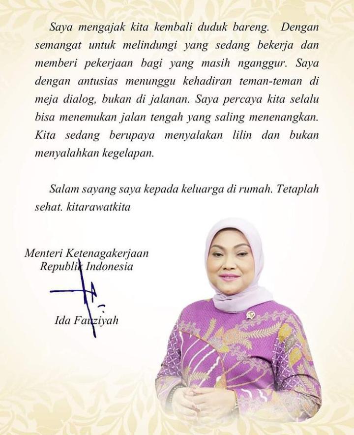 Menteri Tenaga Kerja (Menaker), menulis surat kepada seluruh buruh di Indonesia yang intinya untuk mempertimbangkan kembali rencana turun ke jalan karena ditengah pandemik Covid 19 sangat tidak memungkinkan.