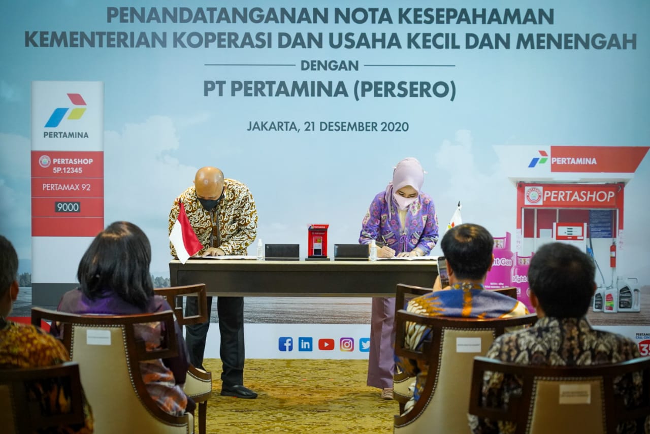 Sinergi Pertamina dan KemenkopUKM ini tertuang dalam penandatanganan Nota Kesepahaman oleh Menteri Koperasi dan UKM Teten Masduki dan Direktur Utama PT Pertamina (Persero) Nicke Widyawati , Senin (21/12).