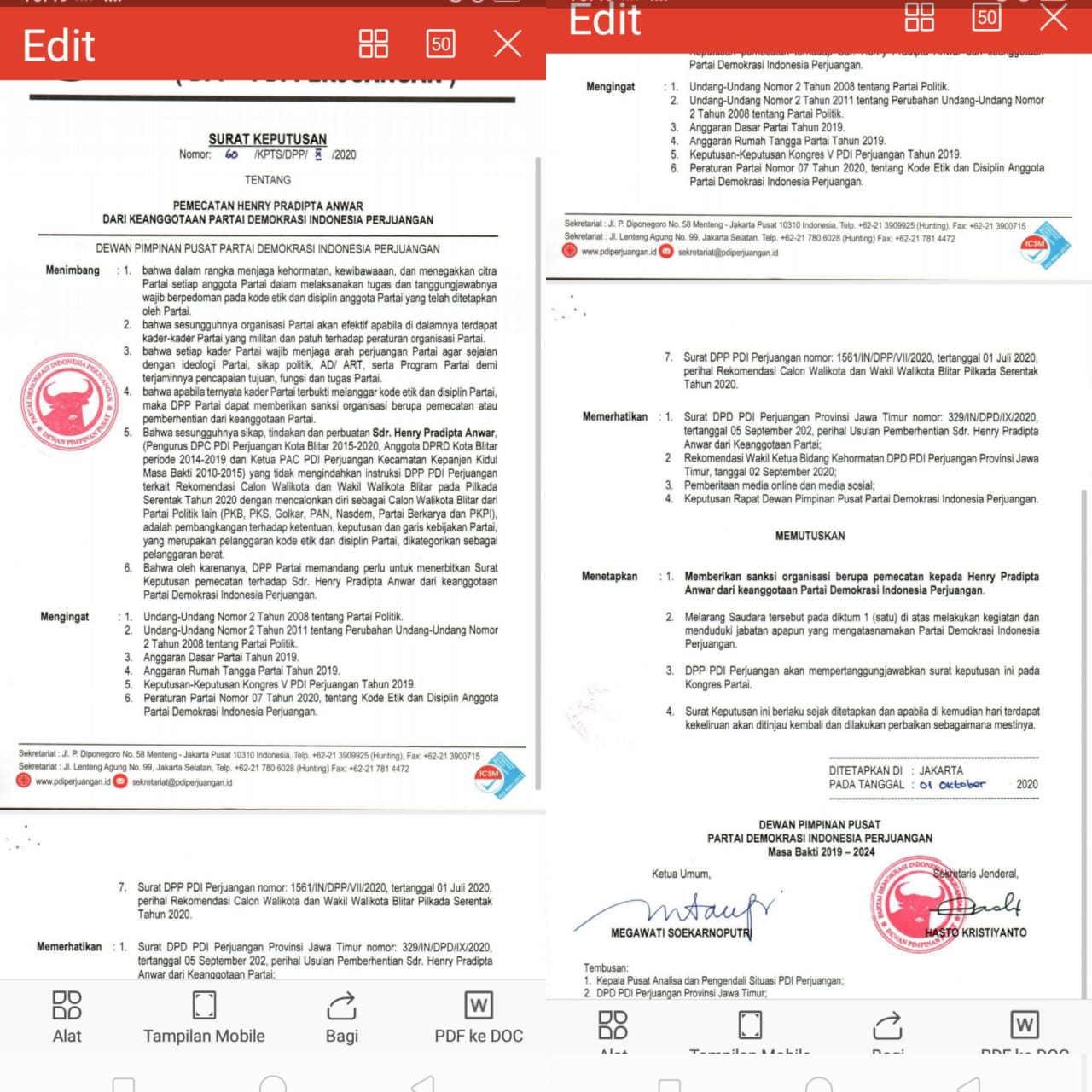 Blitar – Kebijakan Internal Partai berlambang kepala banteng moncong putih ahirnya muncul, kebijakan DPP- PDI.P Nomor:60/KPTS/OPP/X/2020 tentang Pemecatan Henry Pradipta Anwar dari keanggotaan Partai Demokrasi Indonesia Perjuangan berbentuk pdf tertanggal 1 Oktober 2020 tersebut sudah beredar di grup WhatsApp dan menjadi perbincangan menarik para awak media di Blitar.
