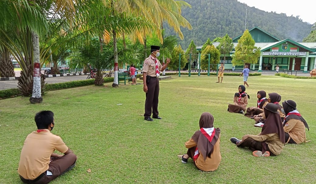 Yapen – Dalam rangka membentuk generasi muda yang berkarakter dan berwawasan kebangsaan, Anggota Staf teritorial Kodim 1709/Yawa Serda Amirudin Abd. Majid Way memberikan pembinaan kepada Pramuka Penegak Saka Wira Kartika (SWK), yang dilaksanakan di Lapangan Upacara Makodim 1709/Yawa, Sabtu (07/11/2020).