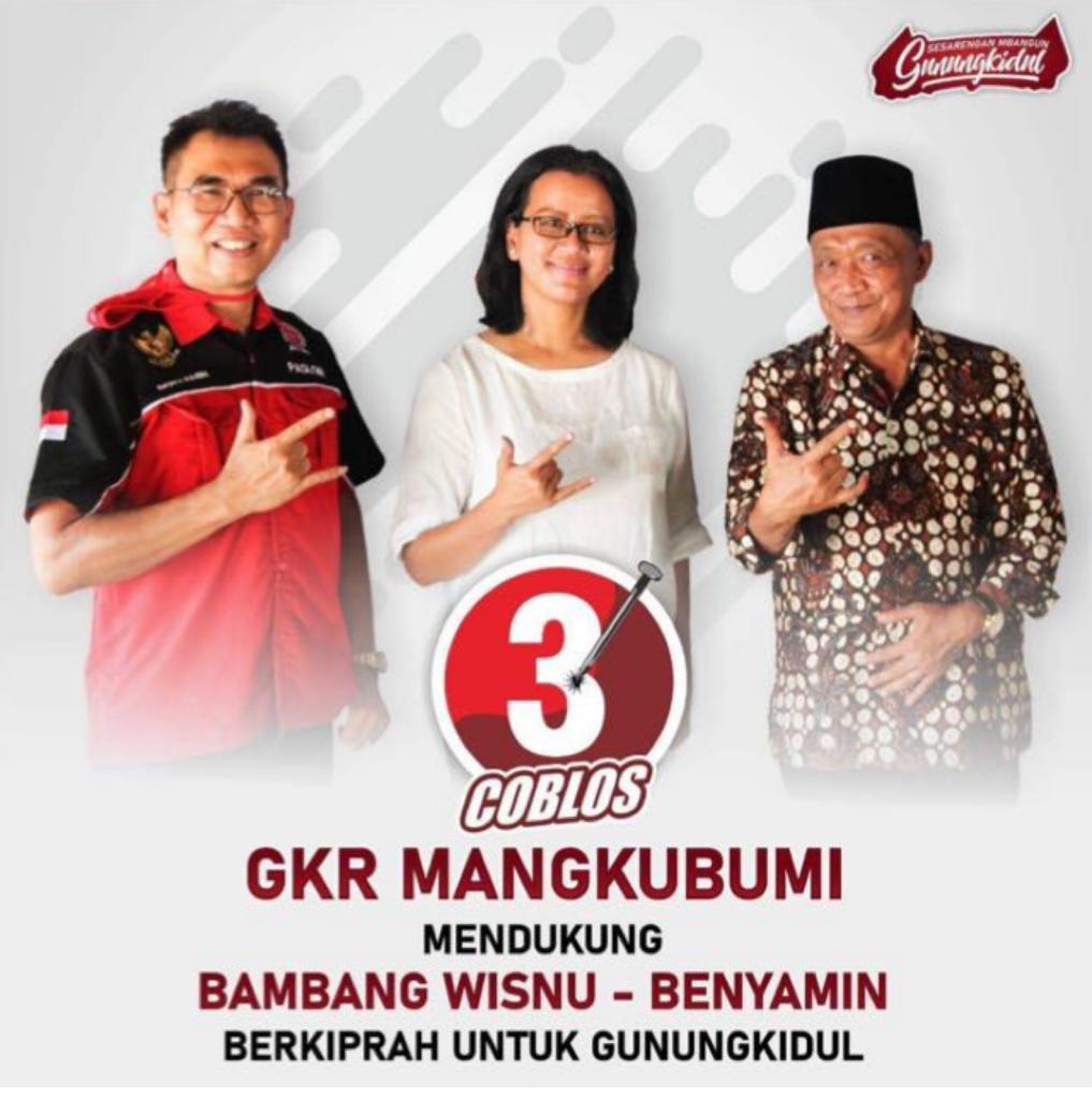 Alasannya, pasangan Nomor 3, yaitu pasangan Bambang Wisnu dan Benyamin Sudarmadi (Babe), merupakan satu-satunya pasangan yang mampu membawa Gunungkidul ke arah kemajuan.