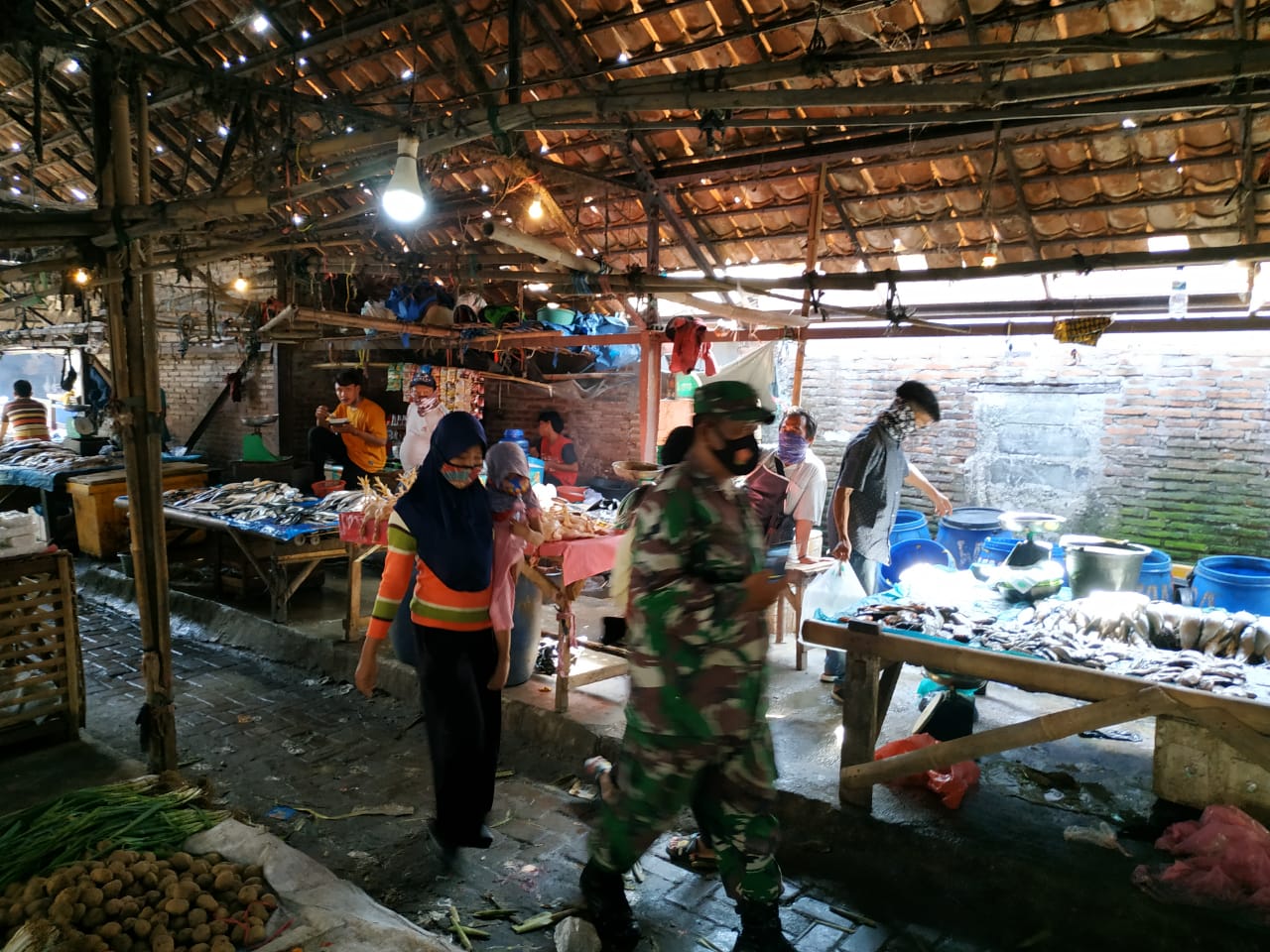 Pasar tempat bekumpulnya banyak orang, jika tidak di terapkan protokol kesehatan ini akan menjadi potensi penyebaran virus Covid 19. Untuk itu Koramil 07/Kresek menghimbau kepada warga baik penjual dan pembeli mentaati protokol kesehatan.