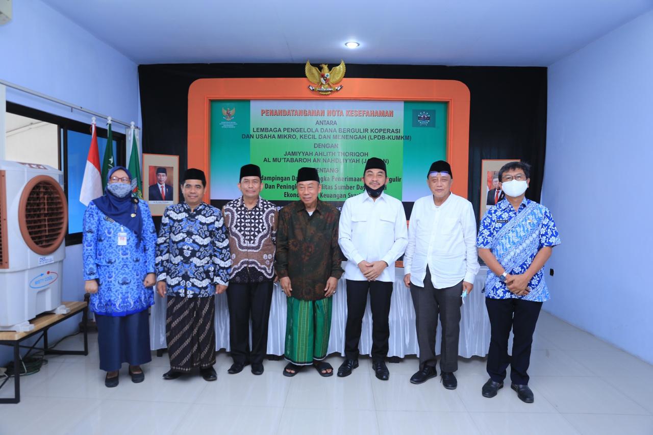 Memorandum of Understanding (MoU) yang ditandatangani oleh Direktur Utama LPDB-KUMKM Supomo dan Wakil Rais ‘Am KH. Ali Mas’Adi yang disaksikan oleh Habib Luthfi selaku Pembina JATMAN dan Direktur Pembiayaan Syariah LPDB-KUMKM Ari Permana. MoU ini merupakan bentuk pendampingan dalam rangka penerimaan dana bergulir dan peningkatan kualitas sumber daya insani ekonomi dan keuangan syariah.