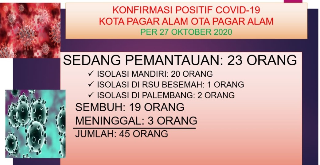 ” Berdasarkan hasil Swab Tes yang dikeluarkan Balai Besar Kesehatan Kota Palembang, hari ini (Selasa, 27/10/20) tercatat ada 13 kasus baru Covid-19. Sehingga total terdapat 45 kasus di Kota Pagaralam, dengan rincian 19 orang dinyatakan sembuh, tiga orang meninggal dan 23 orang menjalani isolasi,” jelas Syamsul.
