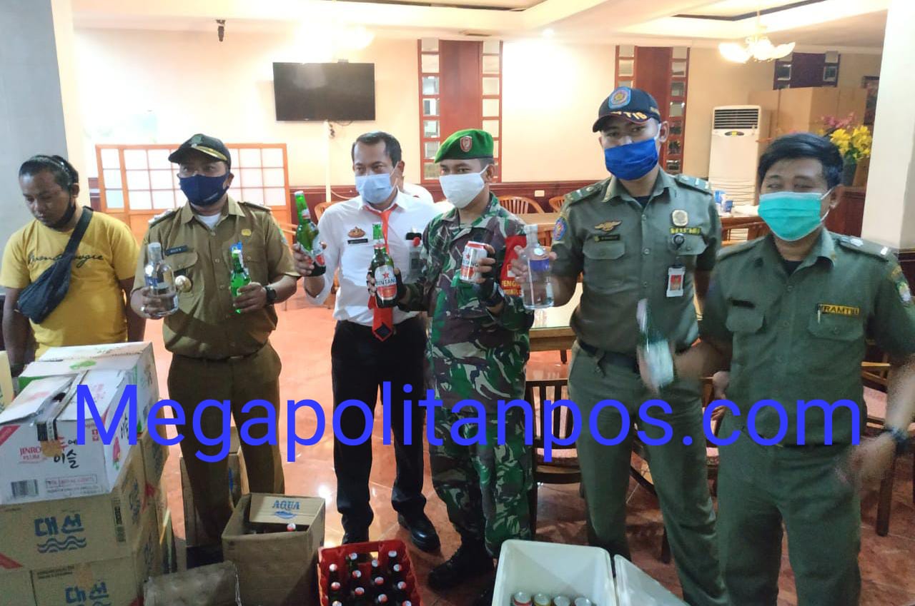 Kedapatan 505 botol beberapa minuman keras (Miras) di lokasi, saat melakukan operasi gabungan Protokol Kesehatan di pertokoan Pinasia Kelurahan Pambar, Kecamatan Cibodas Kota Tangerang.