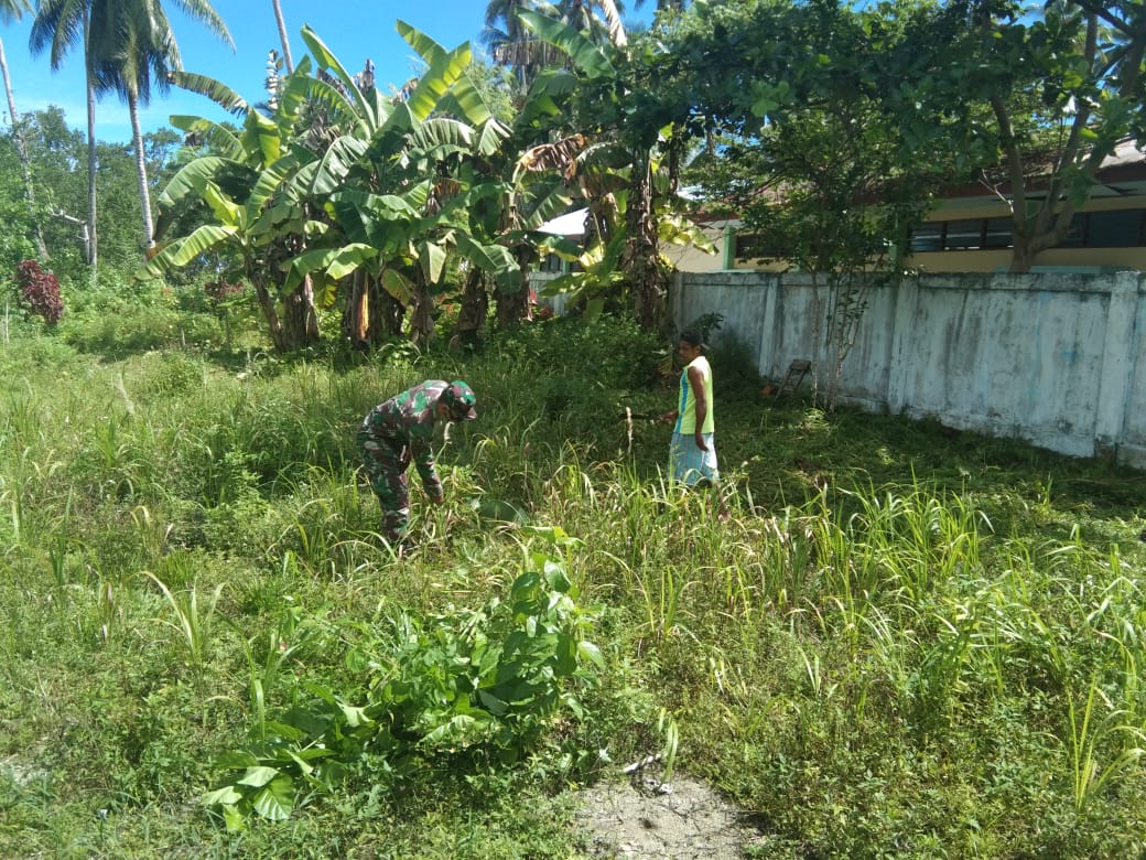 Supiori – Babinsa Koramil 1708-06/Supiori Utara Sertu Yan Pasiga bersama masyarakat kp. Yenggarbun melaksanakan karya bakti pembersihan lingkungan sekolah SD Yenggarbun Selas(05/01/2021)