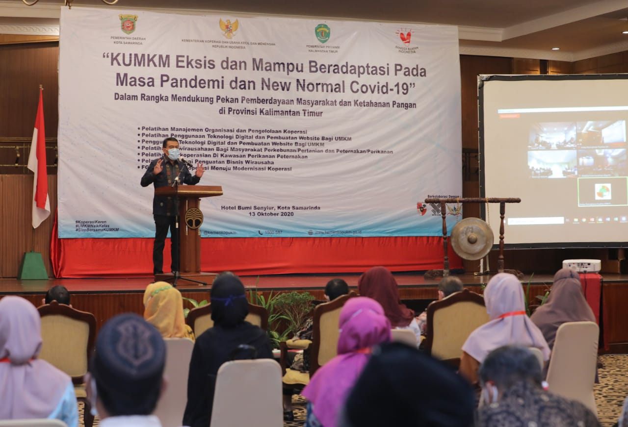 Samarinda – Kementerian Koperasi dan UKM (KemenkopUKM) menggelar pelatihan peningkatan sumber daya manusia (SDM) bagi pelaku Koperasi, Usaha Mikro, Kecil dan Menengah (KUMKM) di Kota Samarinda, Kalimantan Timur, Selasa (13/10/2020).