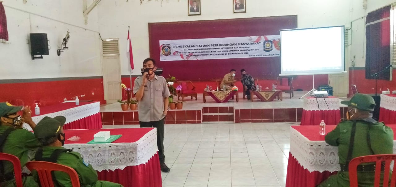 Blitar – Menyongsong pelaksanaan pemilihan Walikota dan Wakil Walikota, Pjs. Walikota Blitar Dr. Ir. Jumadi menghadiri acara pembekalan semua anggota Satgas Perlindungan Masyarakat (Linmas) kota Blitar, bertempat di aula Kantor Kecamatan Kepanjenkidul pada Rabu 24 November 2020.