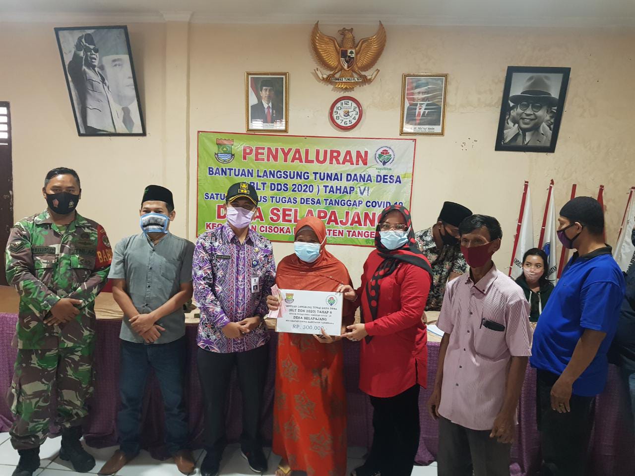 Kabupaten Tangerang – Pemerintah Desa (Pemdes) Selapajang, Kecamatan Cisoka, Kabupaten Tangerang, Banten, menyalurkan Bantuan Langsung Tunai (BLT) Dana Desa Tahun 2020 Tahap VI kepada 196 Kepala Keluarga (KK) secara simbolis, di Kantor Desa Selapajang, Jum’at, (8/10/2020).