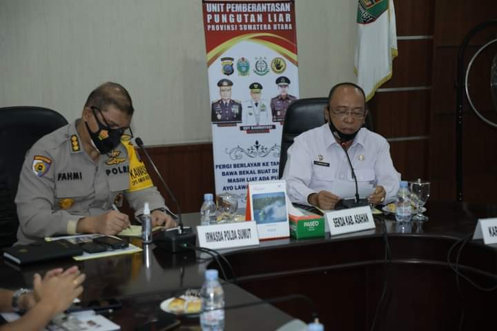 Asahan – Pemerintah Kabupaten Asahan sambut kunjungan Unit Pemberantasan Pungutan Liar (UPP) Saber Pungli Provinsi Sumatera Utara (Provsu) dalam rangka audiensi dan pemantauan lawan persiapan penilaian Kabupaten Asahan sebagai Kabupaten Bebas Pungli di Aula Mawar Kantor Bupati Asahan, Rabu (09/09/2020).