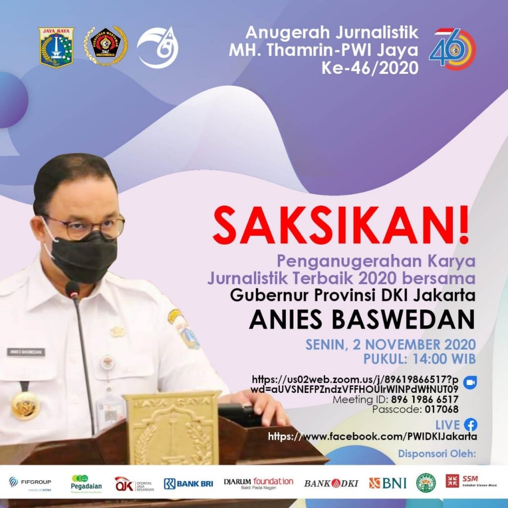 Jakarta – Penganugerahan Jurnalistik MH. Thamrin ke-46 yang digelar oleh PWI Jaya diselenggarakan, Senin (2/11/2020), di Balai Kota Jakarta.