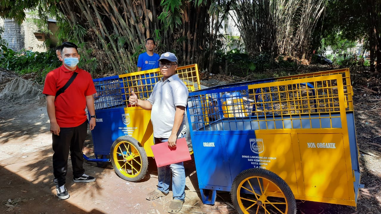 Depok – Sebanyak 2 unit gerobak pengangkut sampah dan perlengkapannya diserahterimakan dari Dinas Lingkungan Hidup Kota(DLHK) –Depok kepada warga dilingkungan Rt008-Rt 006 Rw002 Kelurahan Tirtajaya, Kecamatan Sukmajaya Depok, Jumat(13/11/2020).