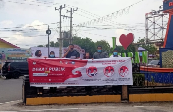 Ajakan tersebut dilakukan menggunakan pengeras suara (megaphone) sembari membentangkan spanduk jadwal debat publik yang akan dilaksanakan KPU Asahan di Hotel Arya Duta Medan pada Sabtu 7 November 2020 mendatang.