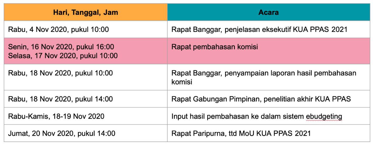Sementara itu, jadwal pembahasan KUA-PPAS tahun 2021 di Pemprov DKI Jakarta rencananya baru dimulai pada 4 November dengan Rapat Badan Anggaran (Banggar) dengan agenda penjelasan dari eksekutif. Setelah itu, pembahasan di tingkat komisi direncanakan akan dilakukan pada 16-17 November dan diakhiri dengan penandatanganan kesepakatan KUA PPAS antara gubernur dan DPRD pada 20 November.