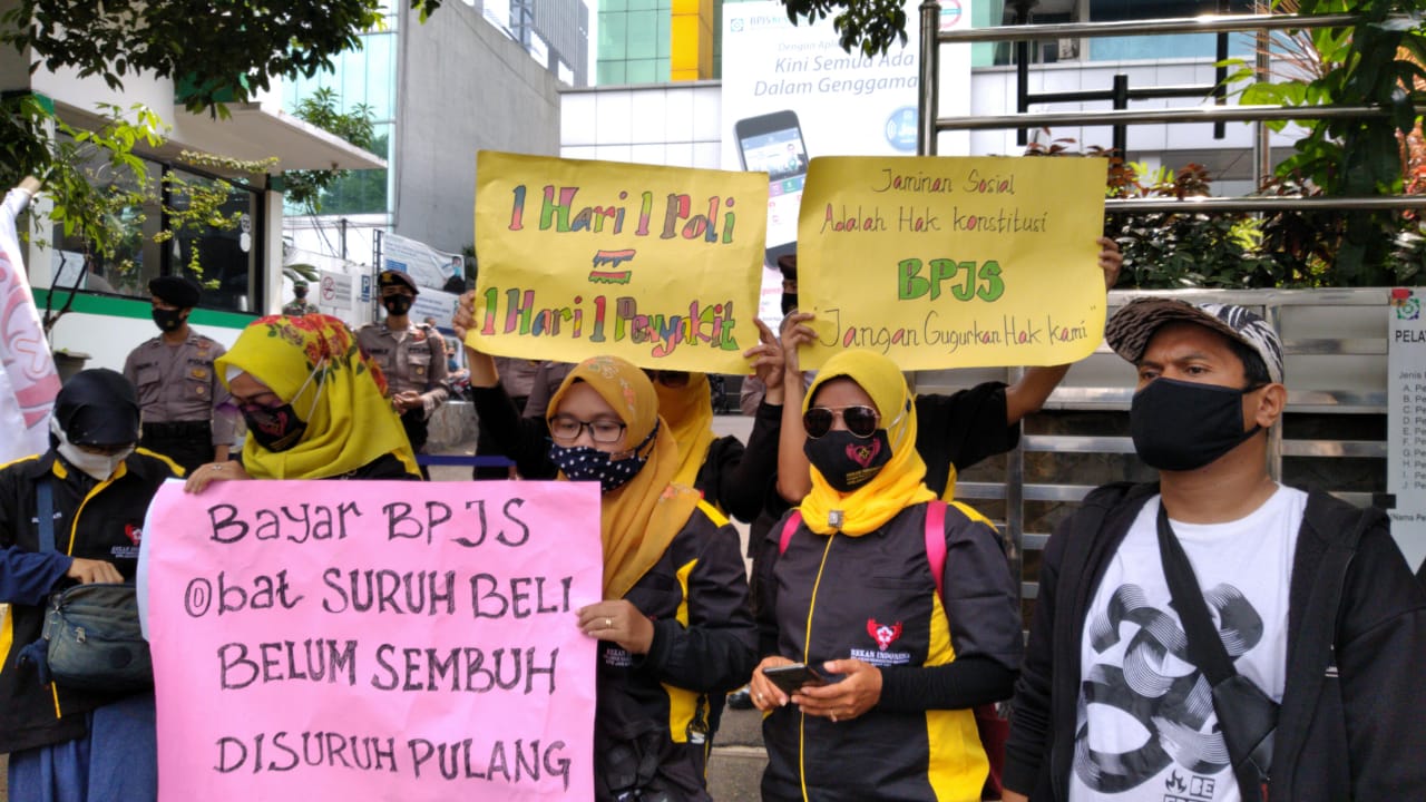 “Kami sering menghadapi situasi keluhan warga yang merasa beban hidupnya semakin berat di tengah pandemik covid19 karena harus ditambah dengan membayar biaya pengobatan ketika sakit” ungkap Tian dalam orasinya.