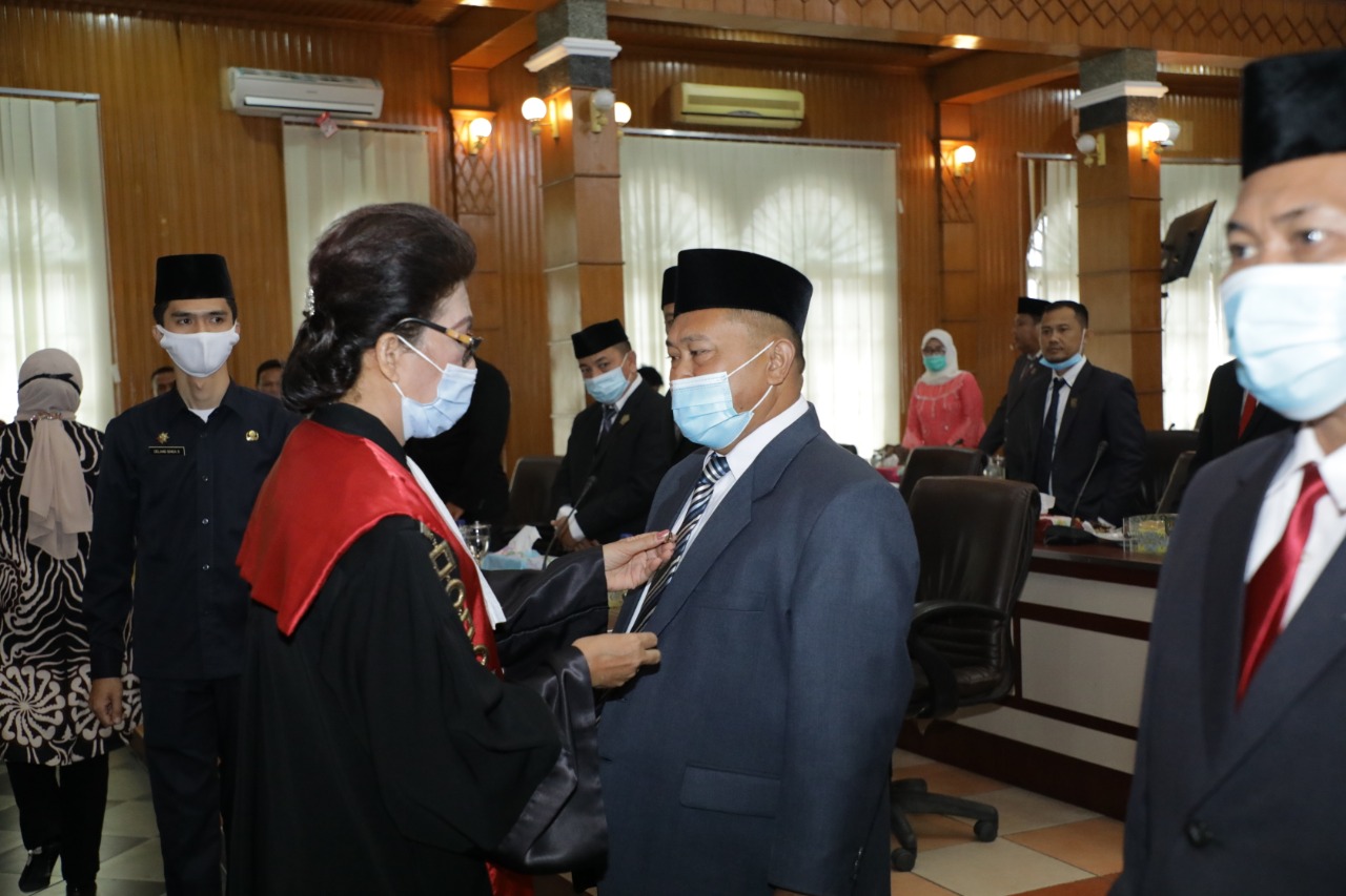 Asahan – Ketua DPRD Kabupaten Asahan H. Baharudin Harahap, SH, MH memimpin rapat paripurna pengucapkan sumpah/janji pengganti antar waktu Anggota DPRD Kabupaten Asahan masa jabatan Tahun 2019-2024 di Aula Rambate Rata Raya Sekretariat DPRD Kabupaten Asahan, Jum’at (11/12/2020).