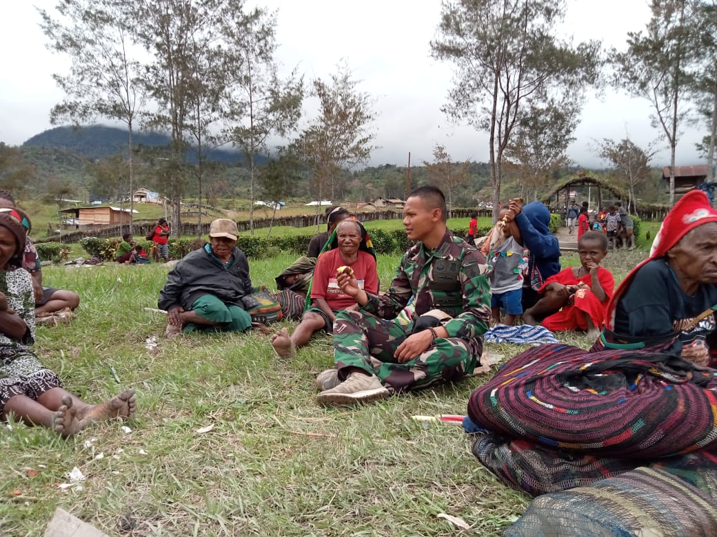 Puncak – Anggota Yon Raider 500/Sikatan sebagai satuan tugas pengamanan daerah rawan Papua wilayah Puncak pimpinan Letnan Dua Inf Sena Nurjabbar laksanakan komsos bersama mama-mama desa Gigobak 1 Distrik Sinak Kab. Puncak, Minggu (27/12/20).