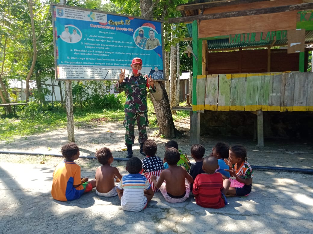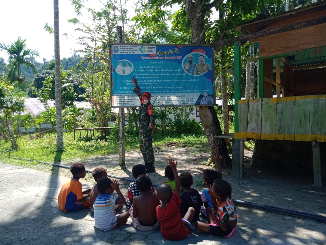 Meskipun kini sudah memasuki libur sekolah dan hanya dengan menggunakan spanduk yang ada di Posko Penanggulangan Covid 19 di Kampung Worioi, anak-anak pun sangat antusias dan bersemangat dalam menerima pelajaran yang diberikan oleh Babinsa.