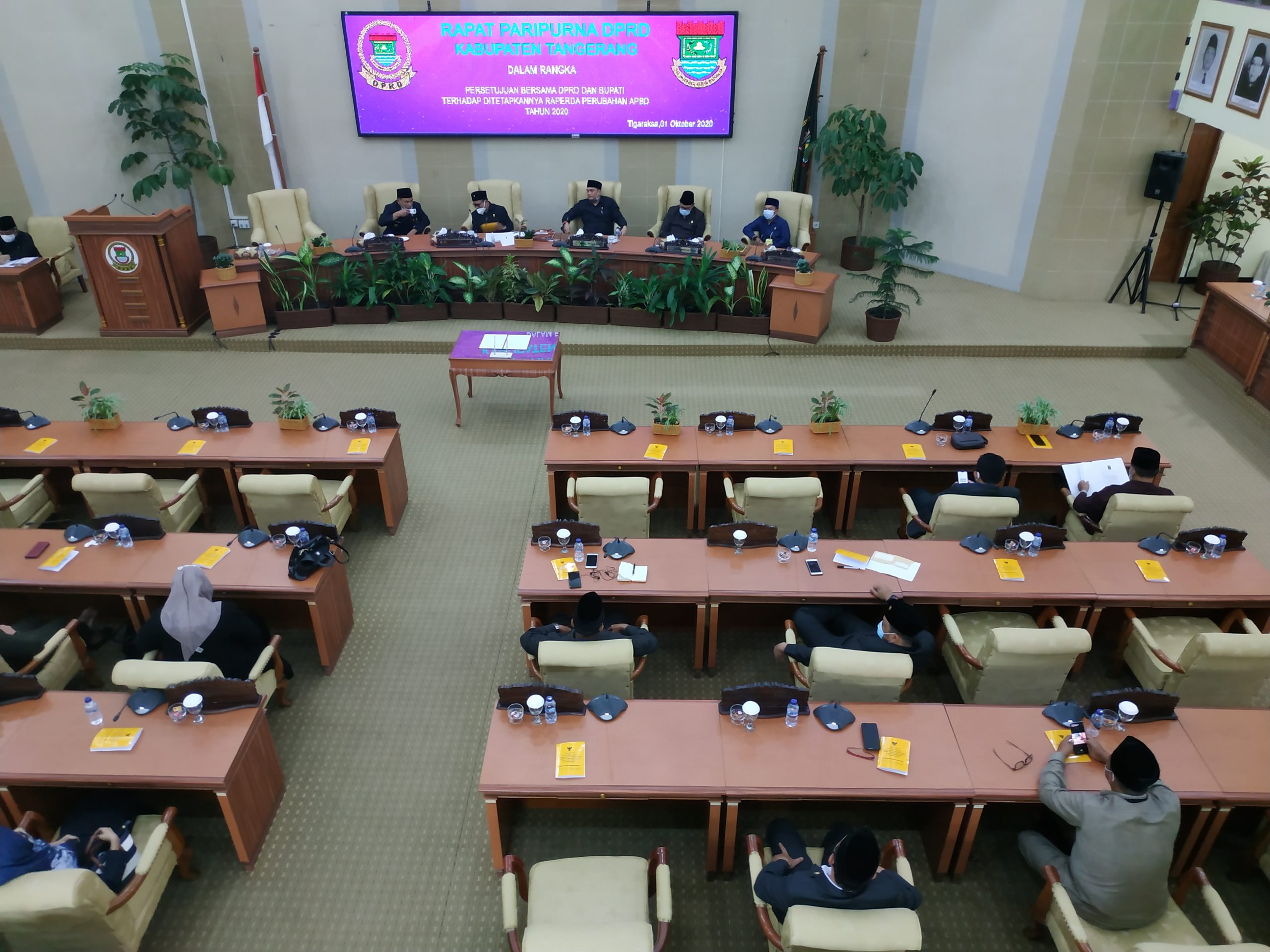 Kabupaten Tangerang – Sidang Paripurna DPRD Kabupaten Tangerang tentang persetujuan bersama antara Pimpinan DPRD dan Bupati Tangerang terhadap Rancangan Peraturan Daerah (Raperda) perubahan Anggaran Pendapatan dan Belanja Daerah Kabupaten Tangerang (APBD) Tahun Anggaran (TA) 2020, Kamis (01/10/2020) di Gedung DPRD Kabupaten Tangerang.