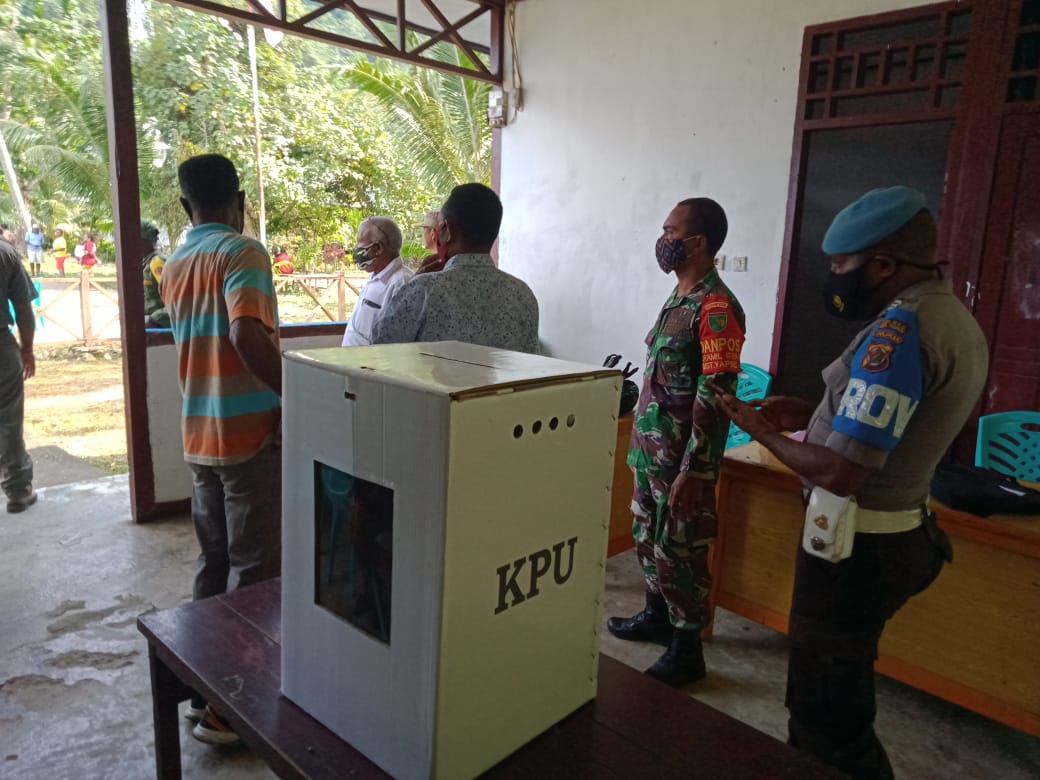 Yapen – Dalam rangka menjaga kelancaran, keamanan dan ketertiban jalannya pesta demokrasi tingkat kampung, anggota Koramil 1709-01/Yapsel bersama dengan personil Polsek Yapen Selatan melaksanakan pengamanan proses Pemungutan Suara Ulang (PSU) pemilihan Kepala Kampung Turu, Distrik Yapen Selatan, Kab. Kep. Yapen, Kamis (03/12/2020).