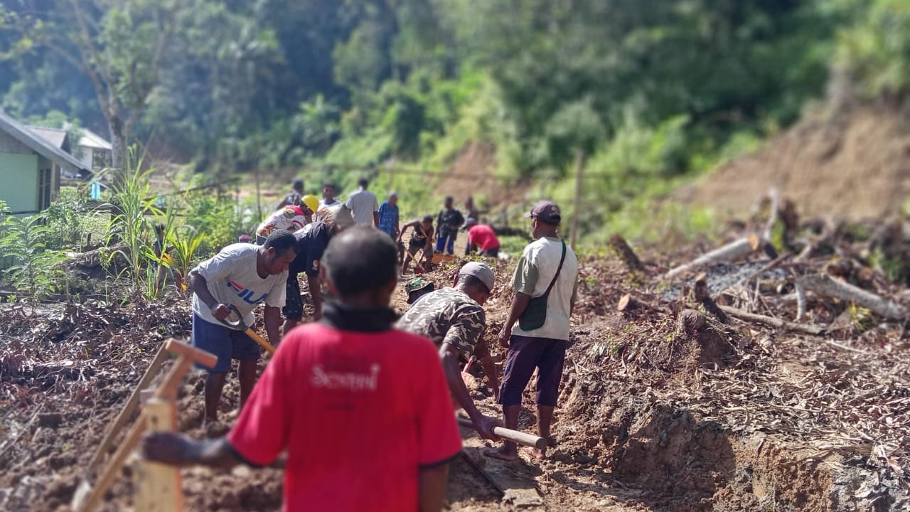 Yapen – Akibat tingginya curah hujan dalam beberapa hari terakhir di Kampung Dumani, Distrik Wonawa, Kab. Kep. Yapen, mengakibatkan jalan yang merupakan akses utama warga dalam beraktivitas kini tertimbun tanah longsor.