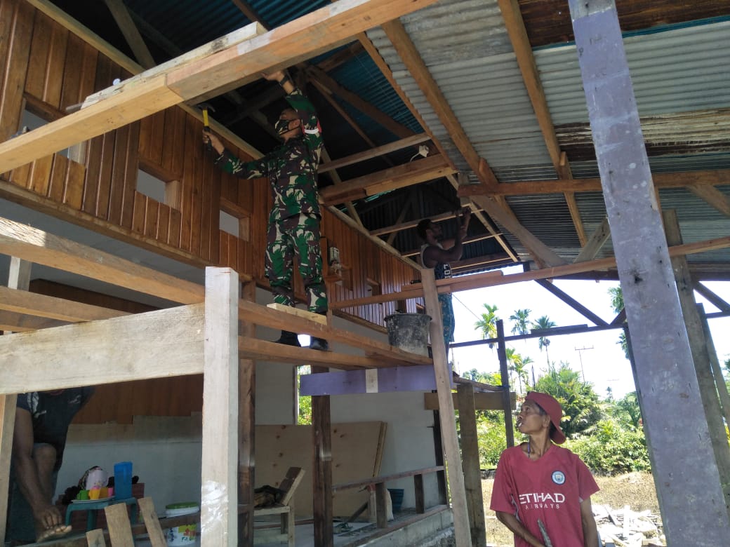 Waropen – Guna meningkatkan solidaritas dan kerjasama yang baik bersama antara babinsa dan warga binaannya, Serda Cun Babinsa Koramil 1709-03/Warbah Kodim 1709/Yawa membantu pemasangan plafon rumah milik warga binaannya di Kampung Urei Faisei I Distrik Urei Faisei Kab. Waropen, Kamis (10/12/2020).