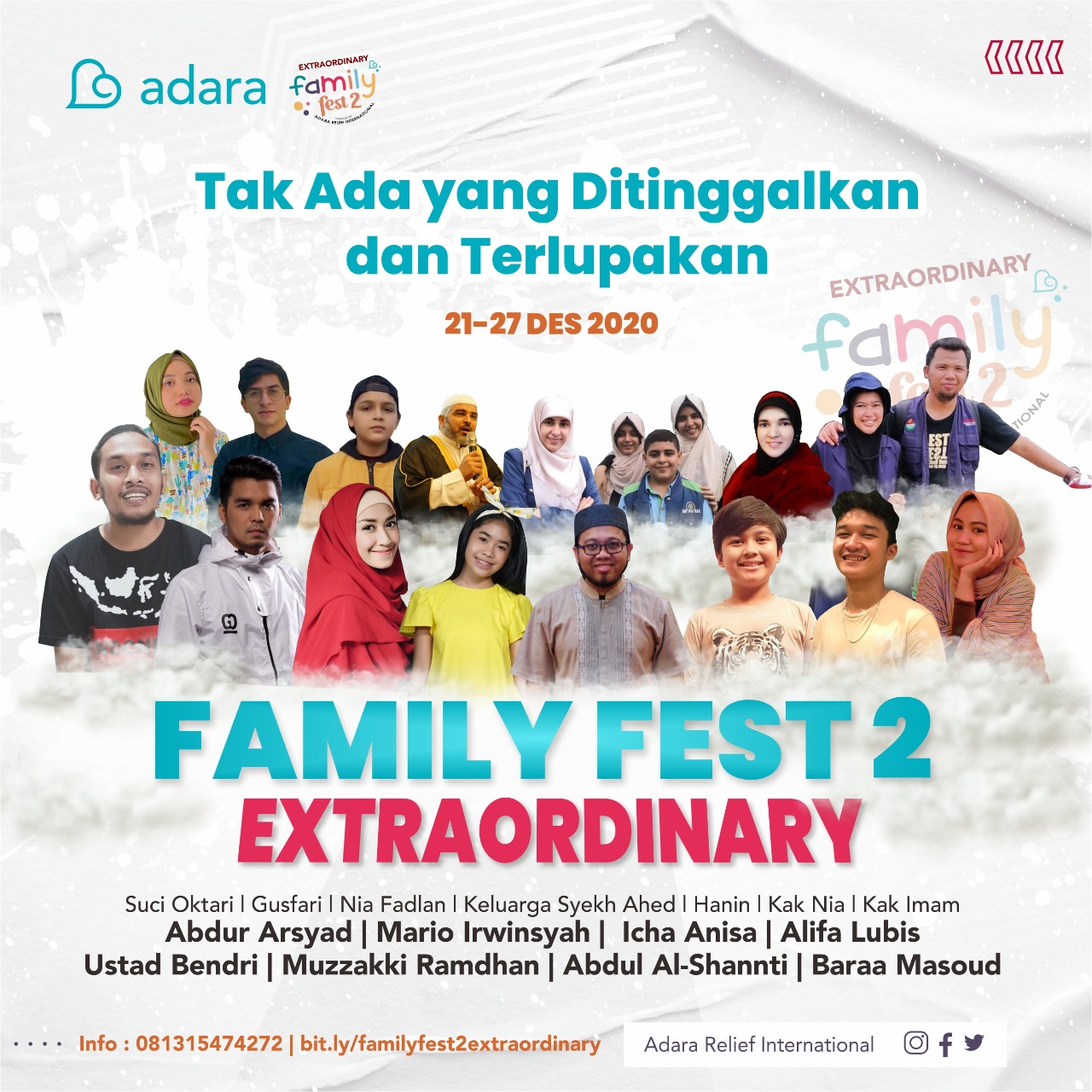 Ikuti media sosial Adara Relief atau kunjungi https://linktr.ee/adararelief untuk info lebih lanjut seputar Family Festival 2 Extraordinary.