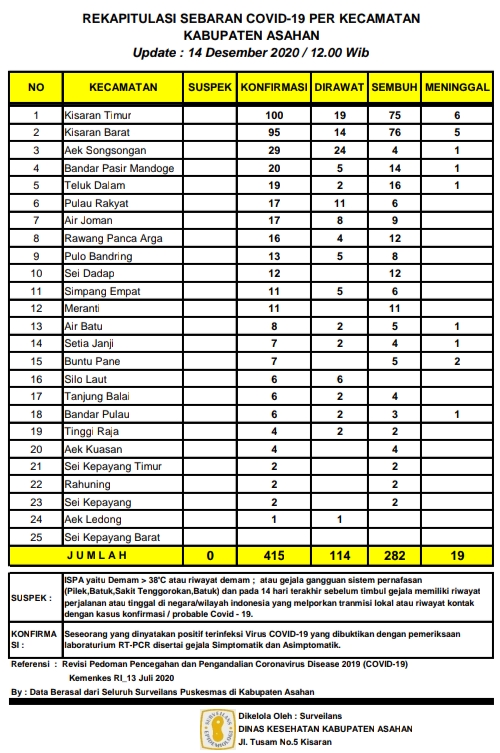Demikian data tersebut disampaikan Juru Bicara Gugus Tugas Percepatan Penanganan Covid-19 Kabupaten Asahan H. Rahmat Hidayat Siregar, SSos, MSi, berdasarkan hasil data surveilans dari seluruh puskesmas yang ada di wilayah Kabupaten Asahan sebagaimana dikelola Dinas Kesehatan Kabupaten Asahan pertanggal 14 Desember 2020 hingga pukul 12.00 Wib, pada hari Senin, (14/12/2020) melalui pesan grup WhatsApp Kominfo.
