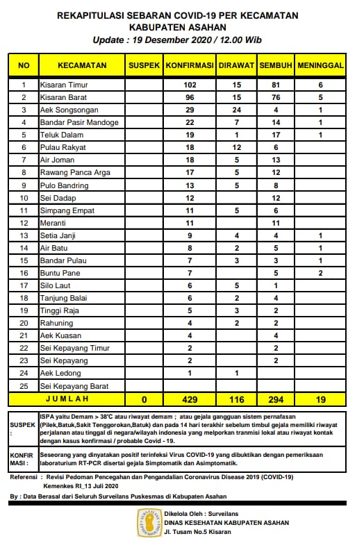 Asahan – Tim GTPP Covid-19 Kabupaten Asahan merilis data surveilans yang dikelola oleh Dinas Kesehatan dari seluruh Puskesmas yang ada di wilayah Kabupaten Asahan, Sabtu (19/12/20).
