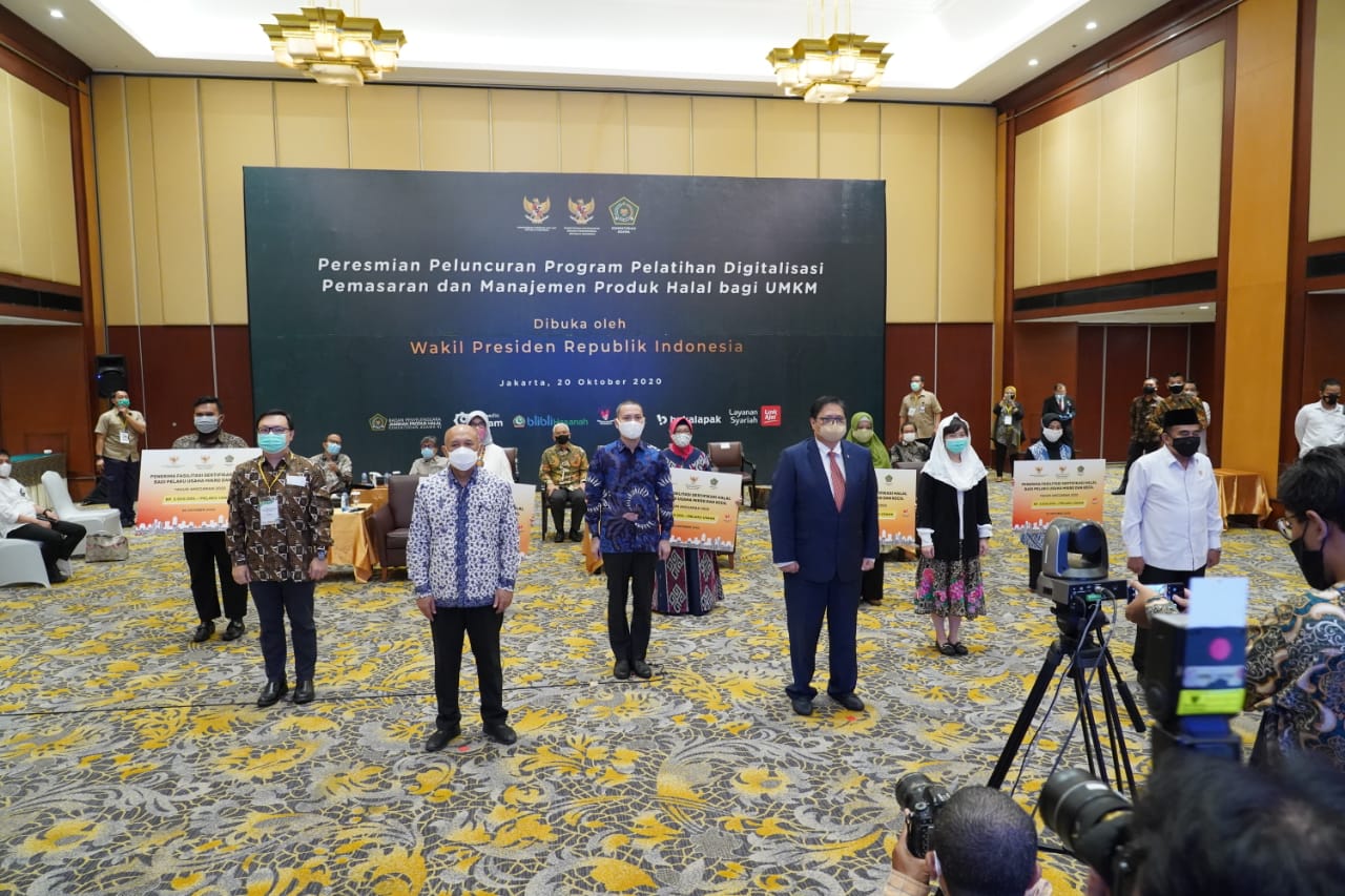 “Kita ingin menjadikan industri halal Indonesia menjadi tuan rumah di negeri sendiri serta sekaligus menjadi pemain global,” kata Wapres Ma’ruf Amin usai membuka “Pelatihan Digitalisasi Pemasaran dan Manajamen Produk Halal bagi UMKM” secara daring di Jakarta, Selasa (20/10/2020). Turut hadir dalam acara itu Menteri Koordinator Bidang Perekonomian Airlangga Hartarto, Menteri Koperasi dan UKM Teten Masduki, dan Menteri Agama Fachrul Razi.
