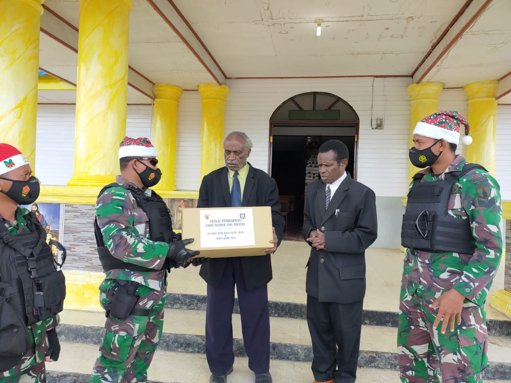 “pembagian bingkisan natal ini merupakan wujud dari kepedulian dan rasa kebersamaan anggota satgas Raider 500/Sikatan kepada warga masyarakat sekitarnya, hal ini juga merupakan wujud rasa suka cita kami dalam merayakan hari natal ini walaupun dilaksanakan dalam kondisi penuh keterbatasan”, ujar Sugiono.
